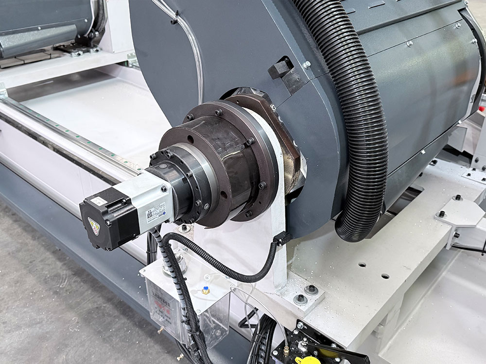 Hydro-pneumatic saw feed. Servo controlled ball screw profile feed. 90 degree …